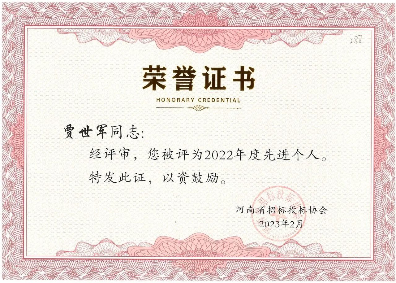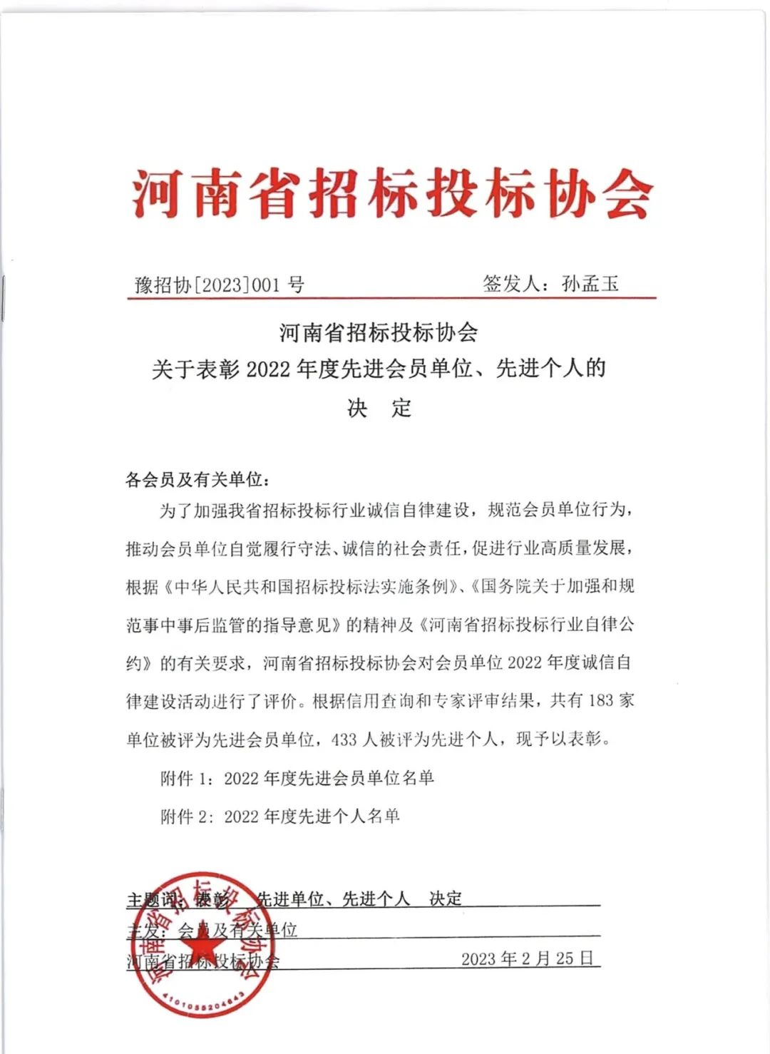 近日,河南省招標(biāo)投標(biāo)協(xié)會(huì)公布了“河南省招標(biāo)投標(biāo)協(xié)會(huì)關(guān)于表彰2022年度先進(jìn)會(huì)員單位、先進(jìn)個(gè)人的決定”。我公司榮獲2022年度先進(jìn)會(huì)員單位榮譽(yù)稱號(hào),八位同志獲得先進(jìn)個(gè)人的榮譽(yù)。