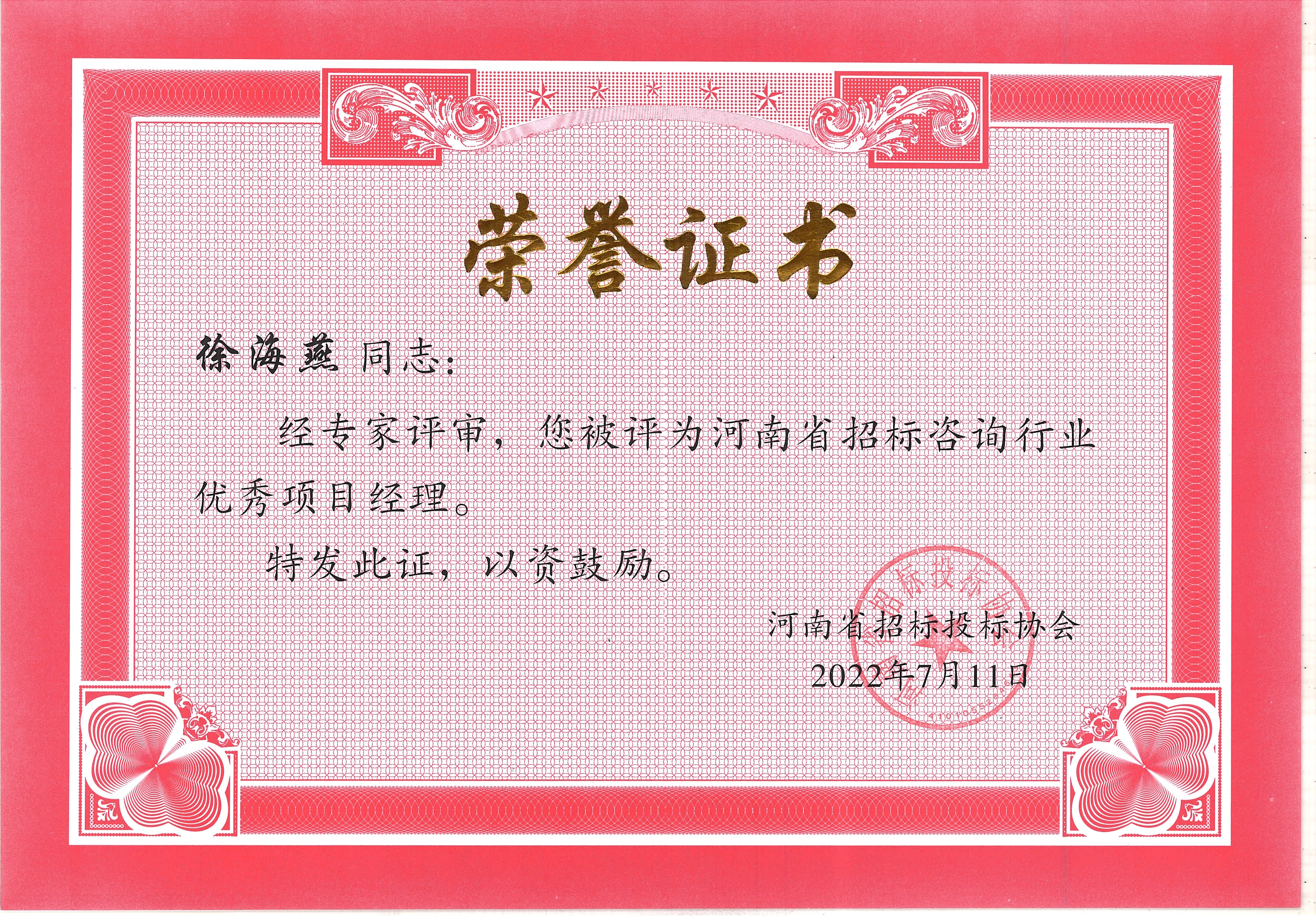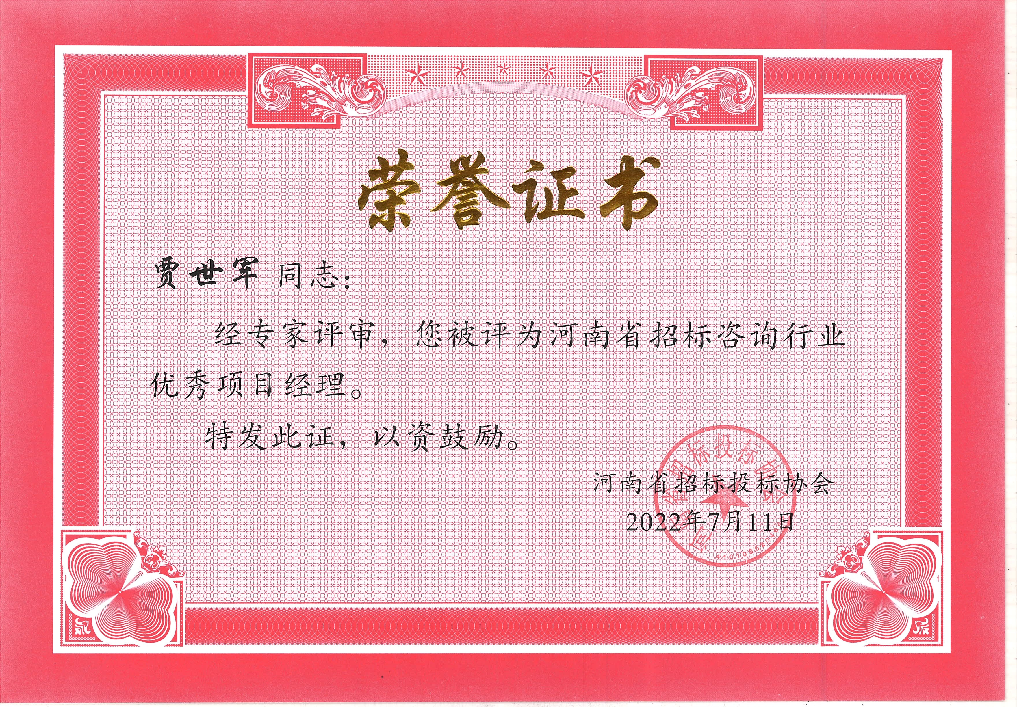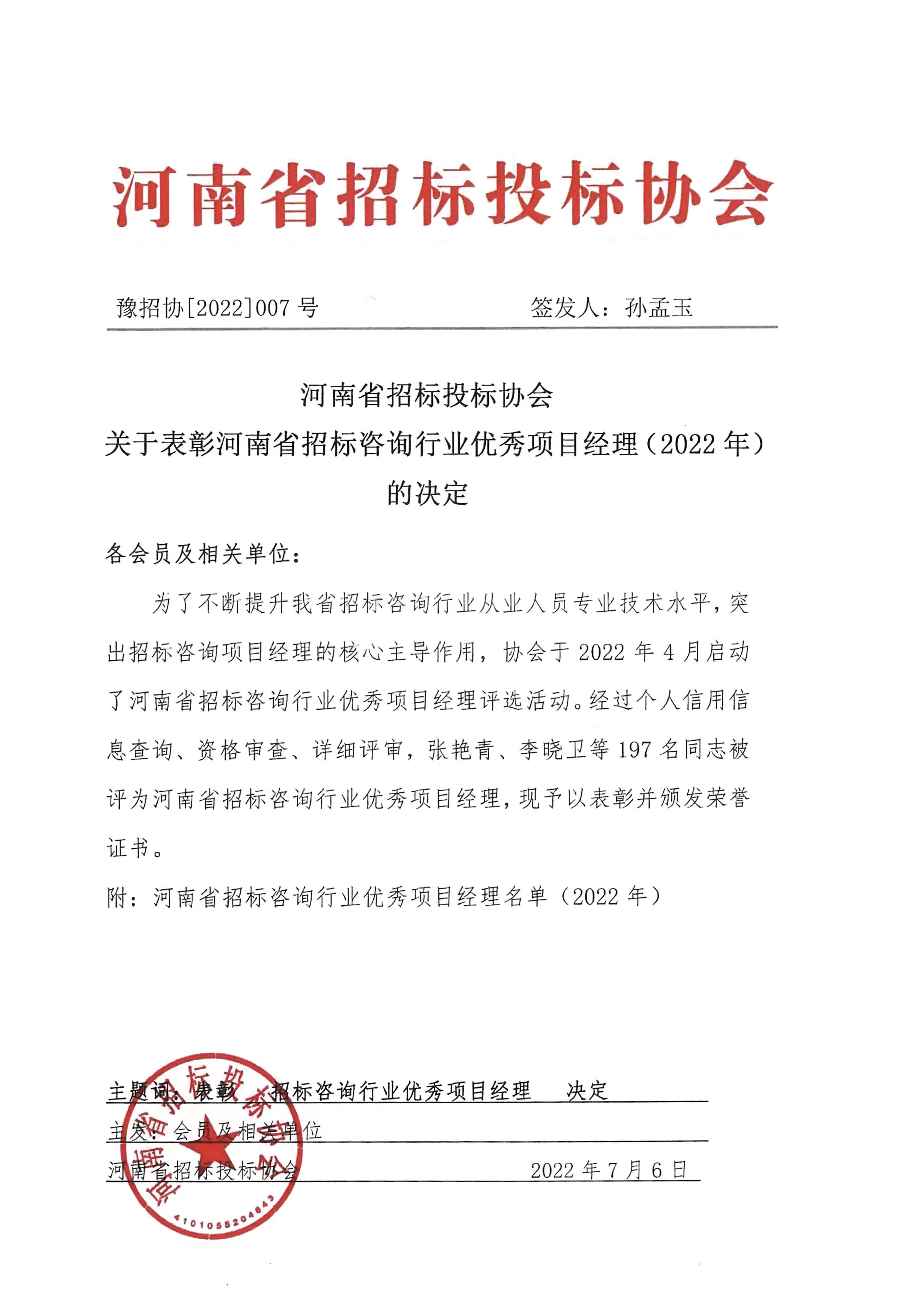 熱烈祝賀我公司張彥令、李杰、石峰、賈世軍、徐海燕、袁明、鄭寧飛、郜琳娜八位同志榮獲河南省招標咨詢行業(yè)優(yōu)秀項目經(jīng)理榮譽稱號。(下附原文)