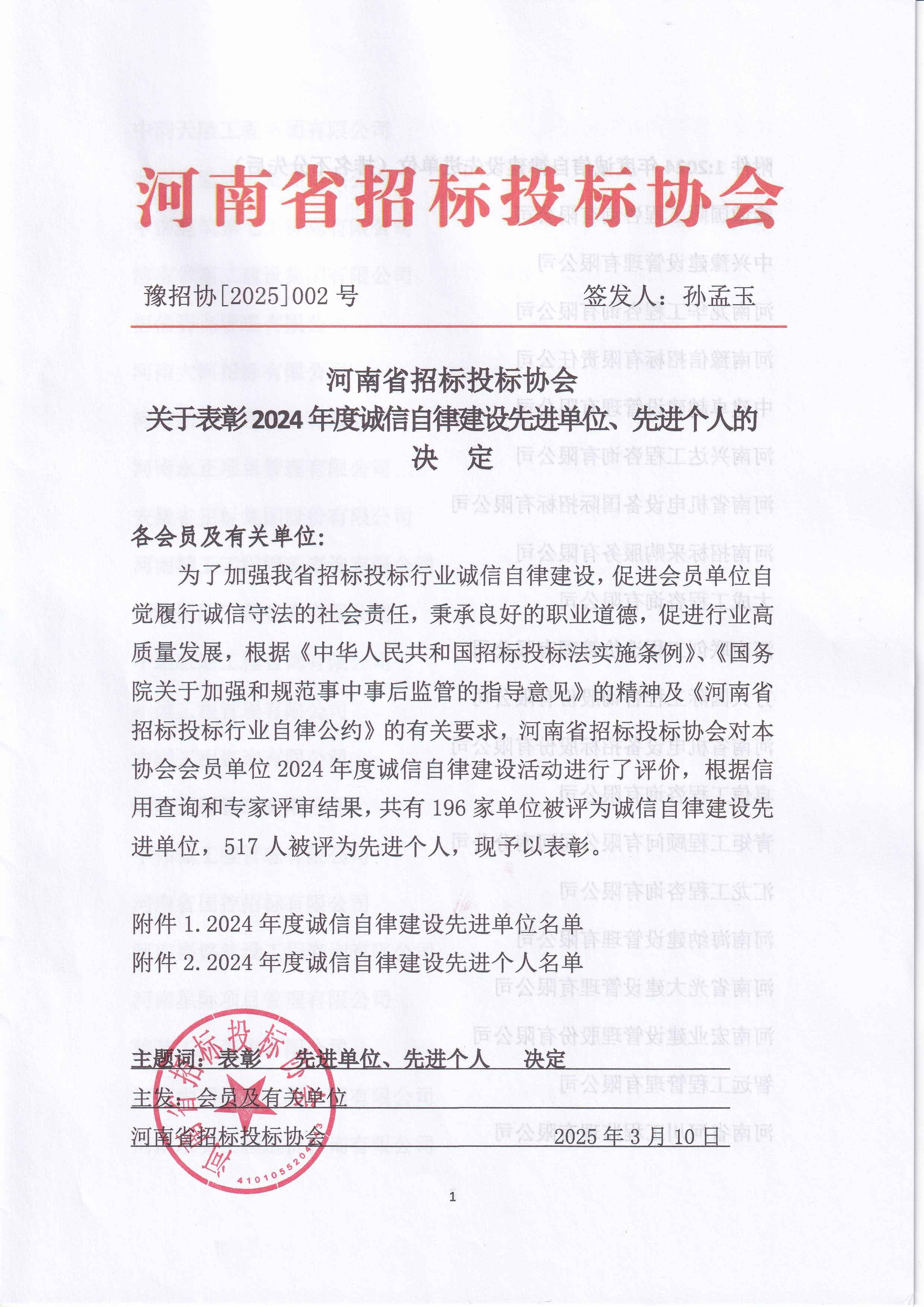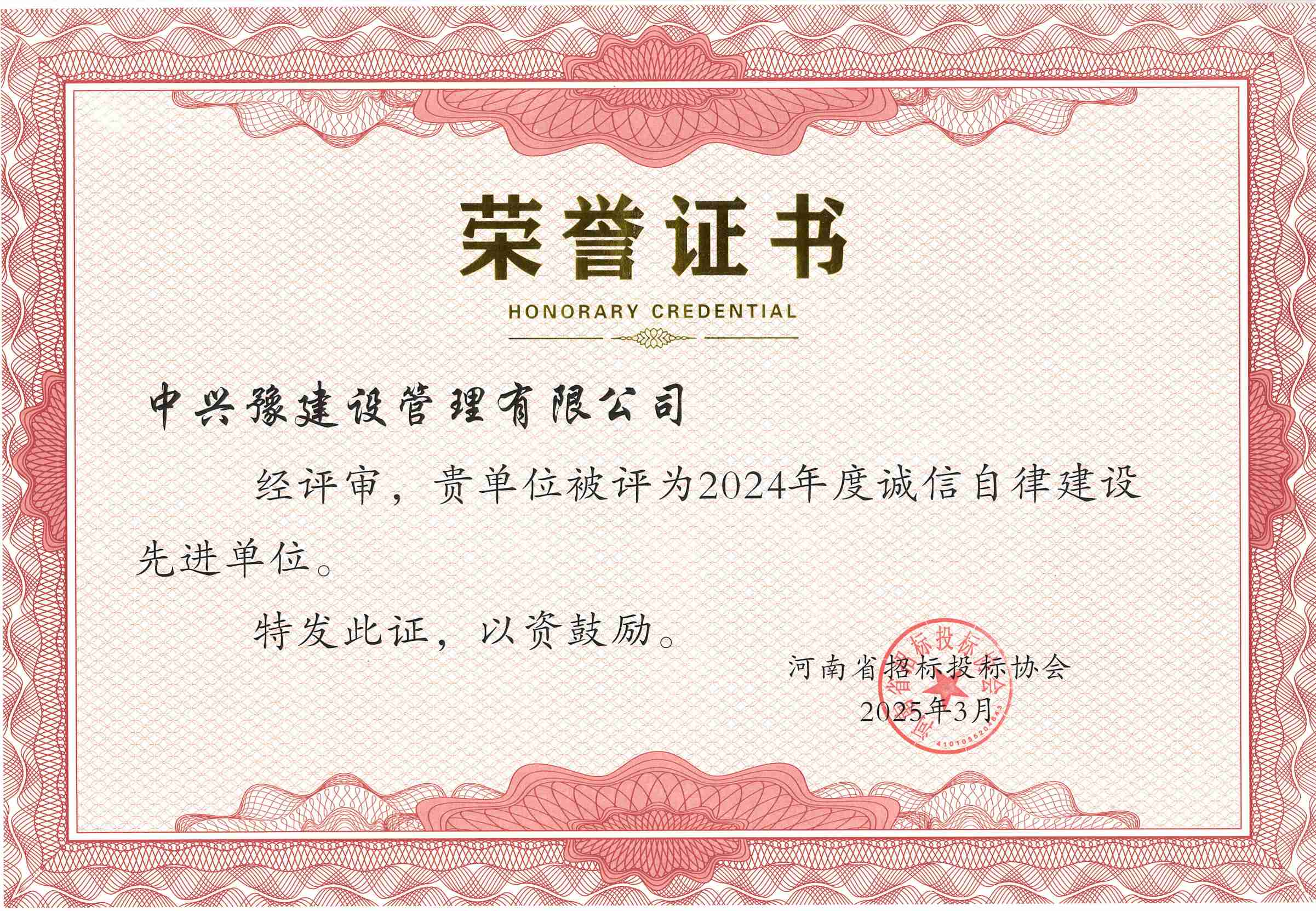 近日,河南省招標(biāo)投標(biāo)協(xié)會(huì)發(fā)布關(guān)于表彰2024年度誠(chéng)信自律建設(shè)先進(jìn)單位、先進(jìn)個(gè)人的決定。其中,中興豫建設(shè)管理有限公司榮幸入選“2024年度誠(chéng)信自律建設(shè)先進(jìn)單位”。