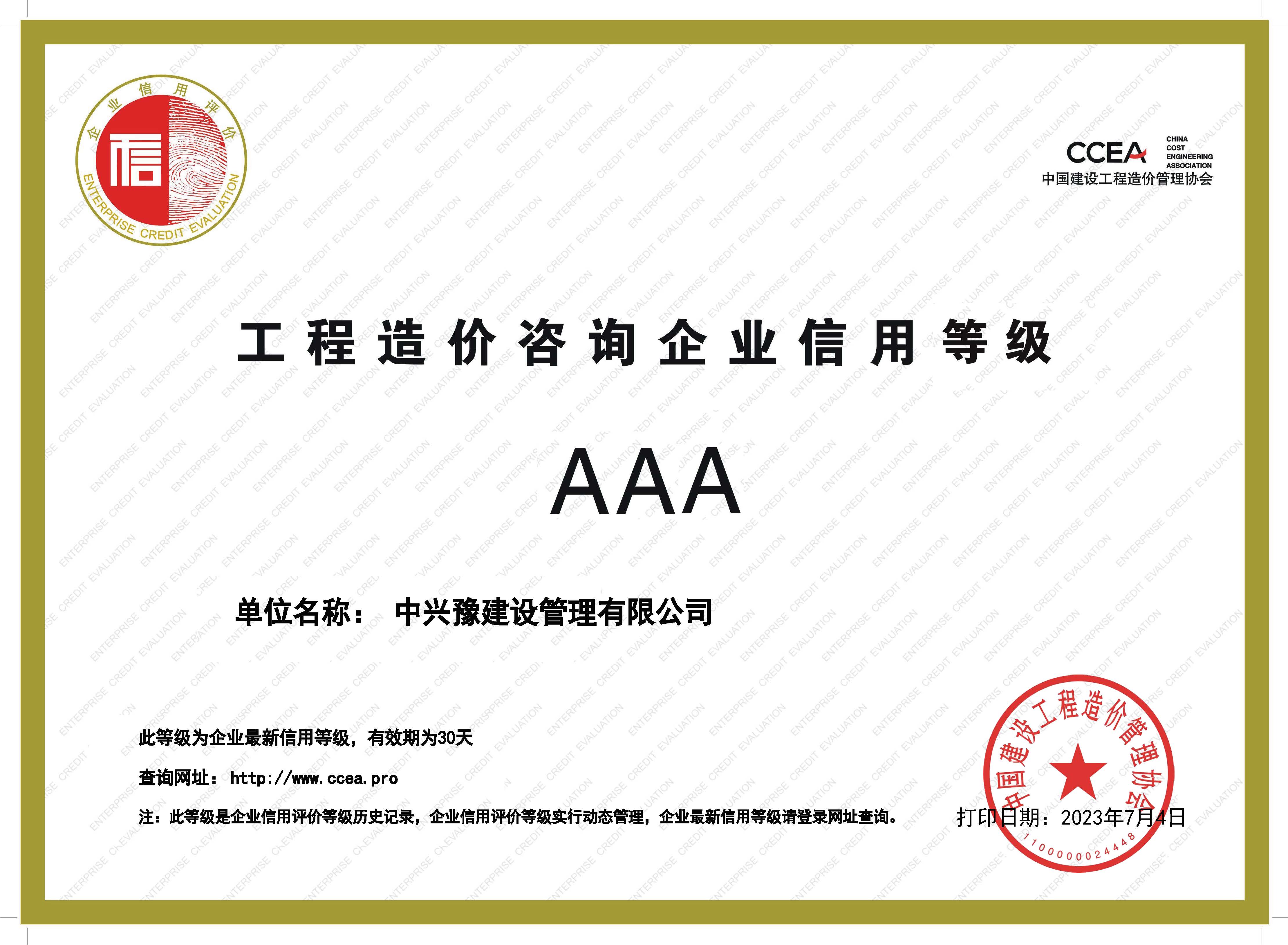 7月4日,中國(guó)建設(shè)工程造價(jià)管理協(xié)會(huì)發(fā)布關(guān)于公布2023年第一批工程造價(jià)咨詢企業(yè)信用評(píng)價(jià)結(jié)果的通知,經(jīng)企業(yè)申報(bào)、各省級(jí)工程造價(jià)行業(yè)協(xié)會(huì)初評(píng),中價(jià)協(xié)組織專家終評(píng)等程序,中興豫建設(shè)管理有限公司榮獲中國(guó)建設(shè)工程造價(jià)管理協(xié)會(huì)信用評(píng)價(jià)AAA級(jí)!