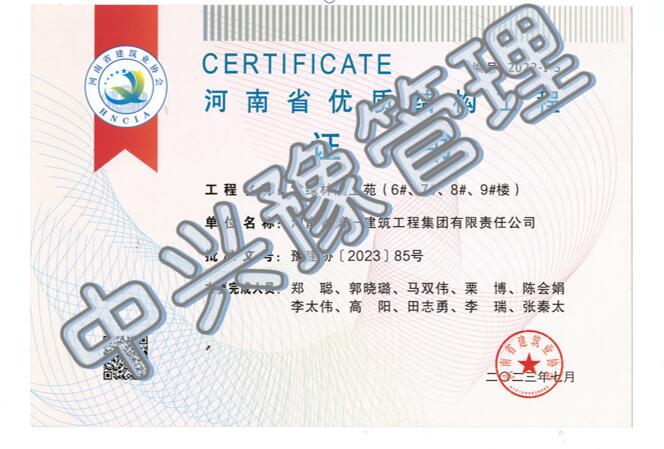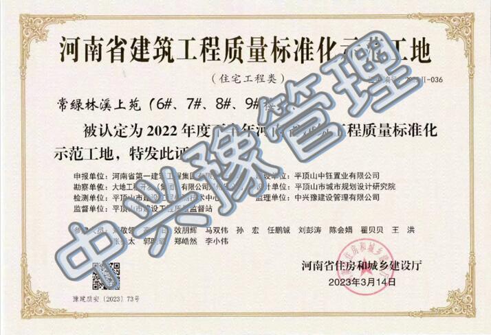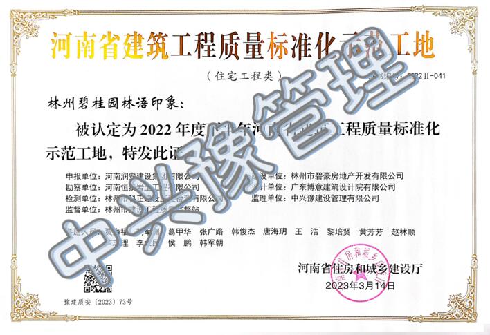 近日,我公司監(jiān)理的常綠林溪上苑(6#樓、7#樓、8#樓、9#樓)項目榮獲“2022年度下半年河南省建筑工程質(zhì)量標準化示范工地”及“河南省優(yōu)質(zhì)結(jié)構(gòu)工程”榮譽稱號;林州碧桂園林語印象項目榮獲“2022年度下半年河南省建筑工程質(zhì)量標準化示范工地”榮譽稱號;濱河西路快速化工程(三標段)項目榮獲“2022年度下半年河南省建筑工程質(zhì)量標準化示范工地”榮譽稱號。