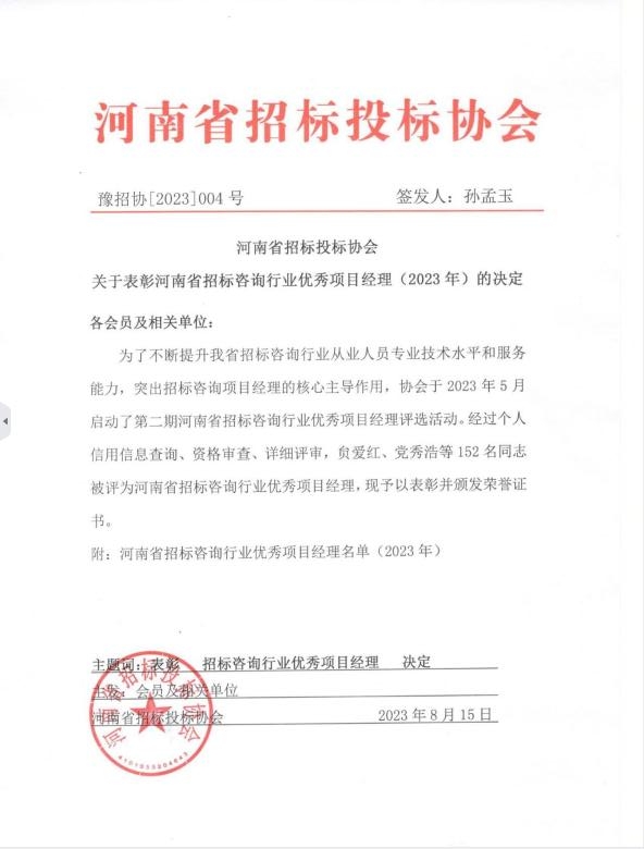 近日,河南省招標投標協(xié)會公布了“關于表彰河南省招標咨詢行業(yè)優(yōu)秀項目經(jīng)理(2023年)的決定”,經(jīng)個人信用信息查詢、資格審查、詳細評審等程序,我公司員工李杰、張彥令、徐文、鄭寧飛榮獲“2023年河南省招標咨詢行業(yè)優(yōu)秀項目經(jīng)理”榮譽稱號!