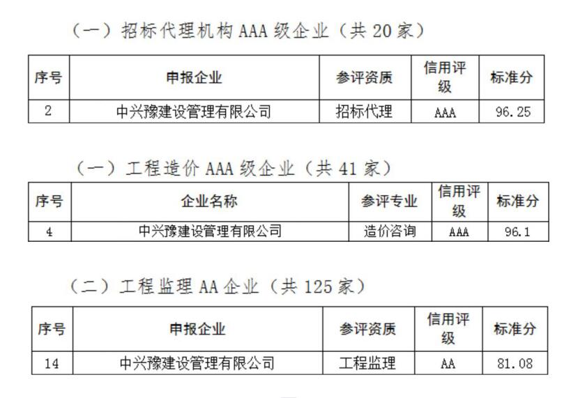 9月27日,鄭州市城鄉(xiāng)建設(shè)局發(fā)布了《關(guān)于2022年度鄭州市建筑企業(yè)信用評(píng)價(jià)結(jié)果的通告》,經(jīng)企業(yè)申報(bào)、主管部門(mén)審核、信用評(píng)價(jià)成員單位共同認(rèn)定及網(wǎng)上公示,中興豫建設(shè)管理有限公司被評(píng)為“招標(biāo)代理機(jī)構(gòu)AAA級(jí)企業(yè)”、“工程造價(jià)AAA級(jí)企業(yè)”、“工程監(jiān)理AA級(jí)企業(yè)”。