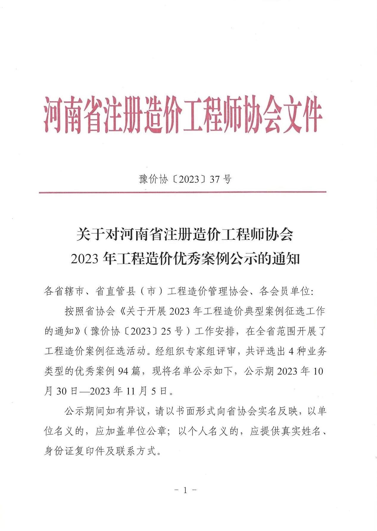 10月30日,10月30日,河南省注冊造價工程師協會公布了“河南省注冊造價工程師協會2023年工程造價優(yōu)秀案例公示的通知”,由中興豫建設管理有限公司負責的“某市政工程施工階段工程造價全過程控制案例”項目榜上有名。