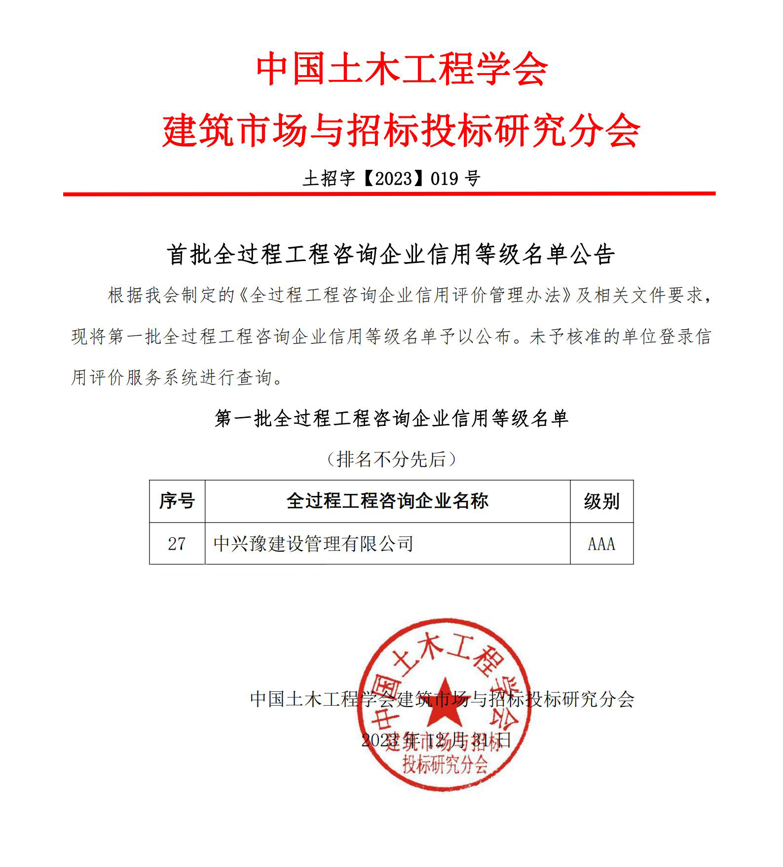近日,中興豫建設(shè)管理有限公司獲評(píng)中國(guó)土木工程學(xué)會(huì)建筑市場(chǎng)與招標(biāo)投標(biāo)研究分會(huì)“首批全過(guò)程工程咨詢企業(yè)信用等級(jí)評(píng)價(jià)AAA企業(yè)”,成為河南省內(nèi)唯一首批獲得該信用評(píng)價(jià)等級(jí)的全過(guò)程工程咨詢企業(yè)。