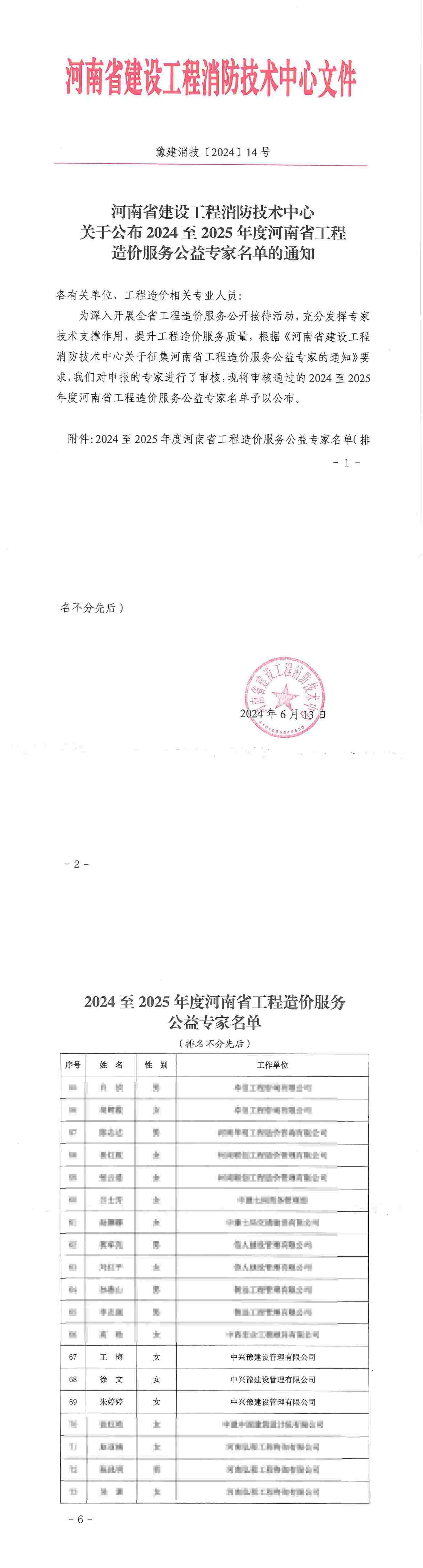近日,河南省建設(shè)工程消防技術(shù)中心公布了《關(guān)于2024至2025年度河南省工程造價(jià)服務(wù)公益專家名單的通知》,中興豫建設(shè)管理有限公司王梅、徐文、朱婷婷三位同志成功入選2024至2025年度河南省工程造價(jià)服務(wù)公益專家名單。