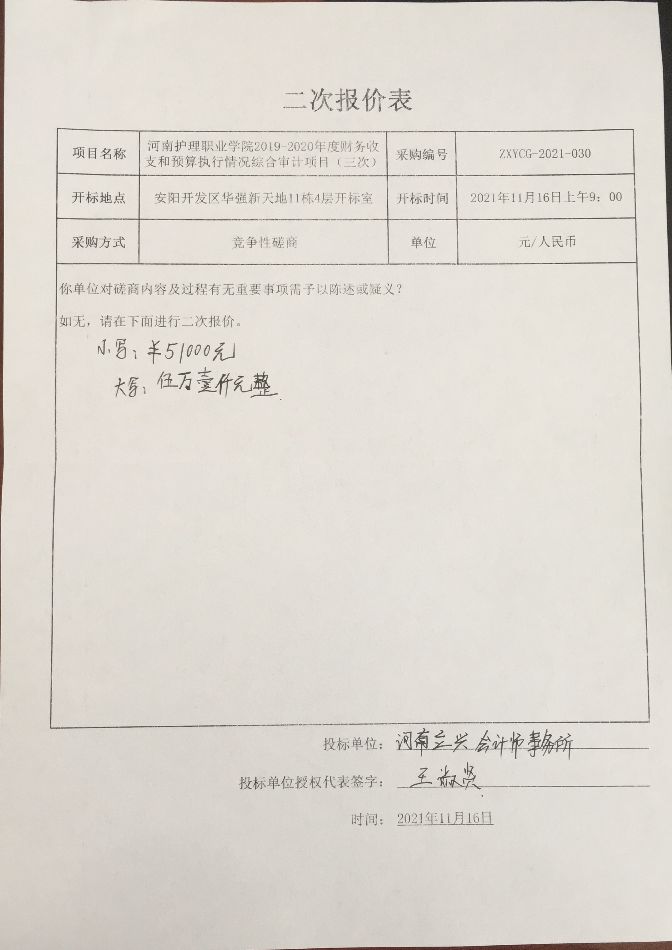 中興豫建設管理有限公司受河南護理職業(yè)學院的委托,就河南護理職業(yè)學院2019-2020年度財務收支和預算執(zhí)行情況綜合審計項目(三次)進行競爭性磋商采購,現(xiàn)將本次采購結果公告如下: